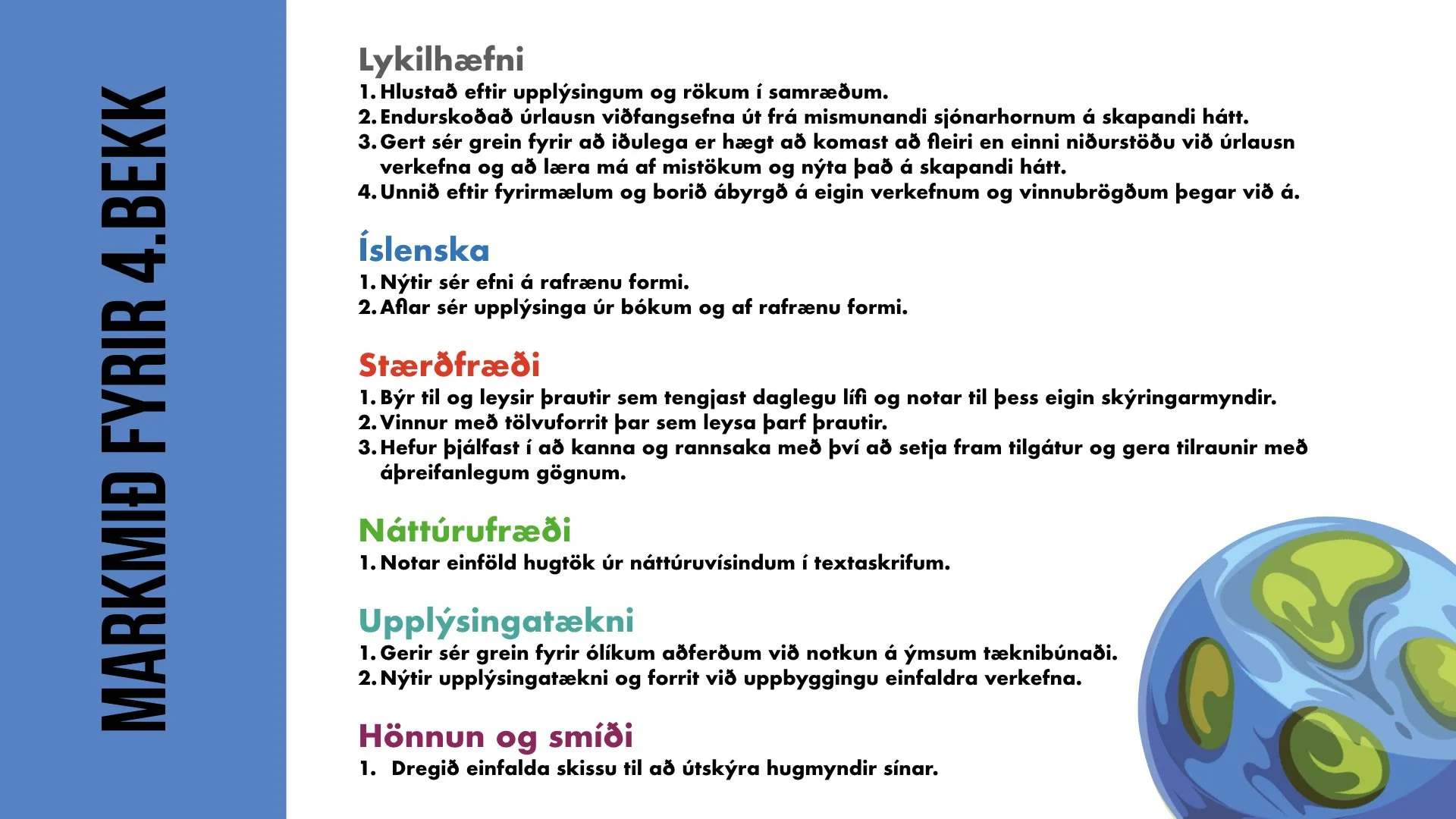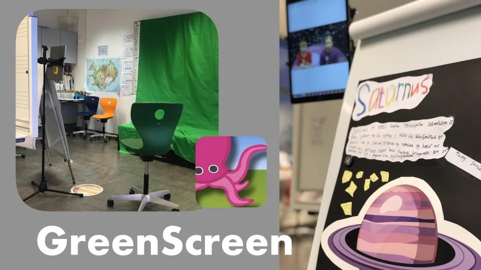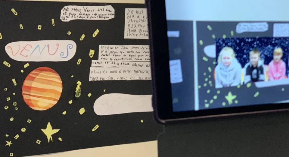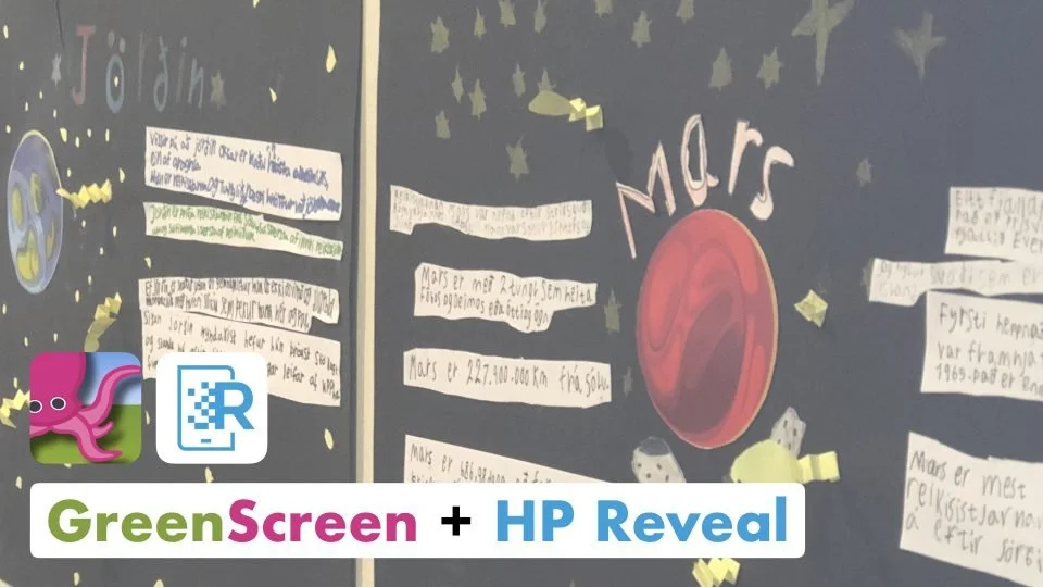 Að lokum vann hver hópur upplýsingamyndband um sína reikistjörnu. Þetta gerðum við með GreenScreen og einum iPad með appinu GreenScreen by DoInk. Þetta krafðist þess að nemendur hefðu æft sig í tjáningu og unnu saman að því að gera sitt myndband sem best og koma upplýsingunum skilmerkilega til skila.Hér að neðan eru allir bakgrunnarnir frá mér, sem kennarar geta sótt og notað sem bakgrunn fyrir hvern hóp í GreenScreen:SólinMerkúrVenusJörðinTungliðMarsJúpiterSatúrnusÚranusNeptúnusPlútó