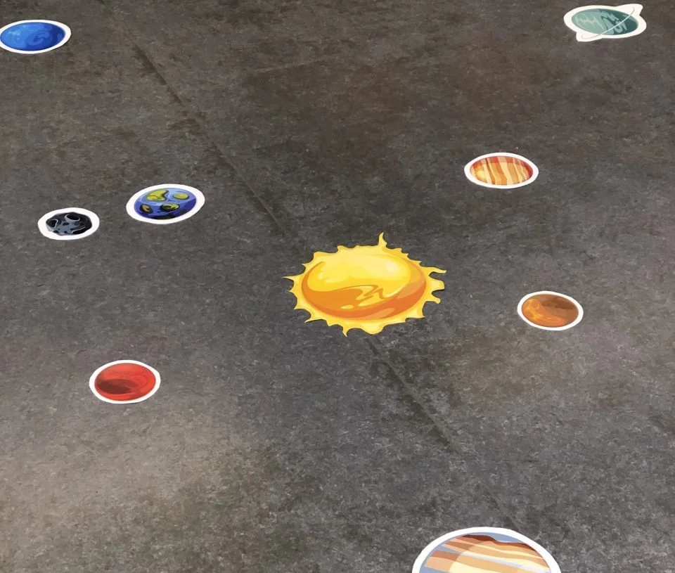 Allar reikistjörnurnar voru límdar á gólfið þannig að nemendur gerðu sér betri grein fyrir innri og ytri reikistjörnunum og hefðu skotmörk til þess að miða geimfarinu sínu þegar það kæmi að því að forrita það.Hér geta kennarar fengið reikistjörnurnar til þess að prenta sjálfir út, líma á gólfið og forrita Sphero til þess að ferðast á milli: Reikistjornurnar_IngviHrannar