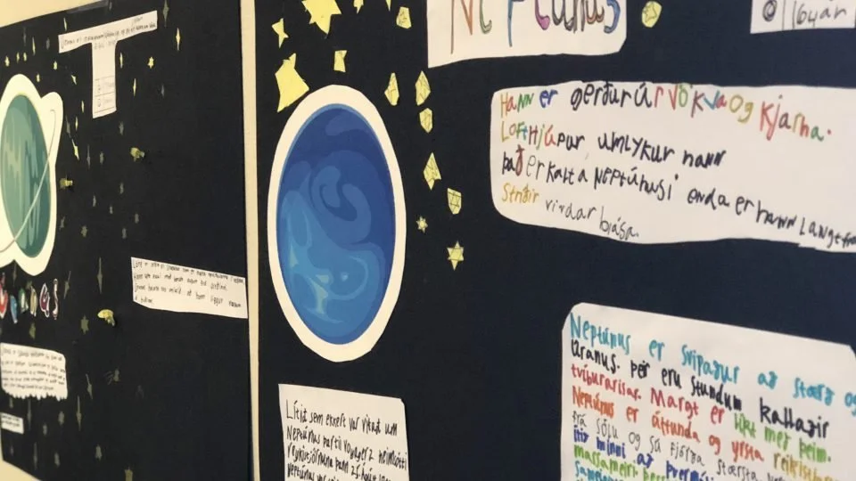 Í árganginum eru 27 nemendur og skiptum við þeim í 9x 3ja manna hópa. Hver hópur fékk eina reikistjörnu eða sólina og áttu að fjalla um hana ítarlega, bæði með texta, plakati og myndbandi.Nemendur fengu m.a. að „fara á" reikistjörnuna sína í Google Expeditions og unnu plakat um sína reikistjörnu.Það sem nemendur fengu að gera einnig var að skoða reikistjörnuna sína í gagnauknum veruleika (Augmented Reality) í gegnum Google Expeditions appið. Það voru svokallaðir 'triggerar' prentaðir út og kennarinn lét reikistjörnuna birtast í stofunni og gátu nemendur gengið í kringum hana og skoðað með eigin augum.