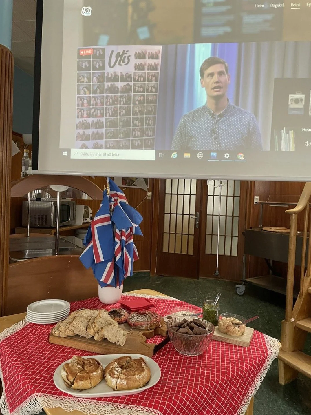 The video (in Icelandic) shows a glimpse of what a watch party looks like!